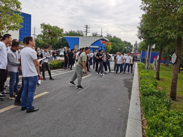 今年的国庆活动共4个项目,分上、下午两场。上午举行的是单人项目投飞镖和团体项目单脚跑火车,下午举行的是顶球跑和拔河,活动地点在办公楼前广场。大红灯笼高高挂,火红的横幅拉起来,国庆节氛围营造,让人激情澎湃,办公楼上“团结、诚信、拼搏、共赢”的企业精神催人奋进。