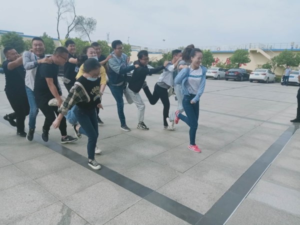 “投飞镖”活动结束,大家意犹未尽,顾不上休息,马上投入下一个团体项目单脚火车跑:7人排成一列,每人仅用右脚支撑。后一人右手搭前一人肩,左手托住前一人左脚,多队并排一起站在起跑线上。裁判发令后各队齐出,赛程为20米,用时少者为优胜队,每次每个参赛队至少有2名女队员参加,比赛过程中脚掉下来的队伍为犯规,将失去比赛资格。这是一个考验团队协作的项目,大家需步调一致才能顺利快速前行。比赛过程中,姿态百出,前仰后合,笑料百出,趣味十足。能顺利前行的队几乎没有,均困难重重,甚至有几个队刚一出战便有人跌倒,不气馁,顾不上疼痛,迅速爬起来调整队形再出发。最终财务部组队赢得了冠军。