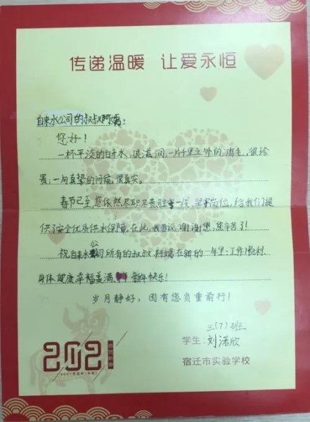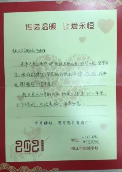 正如孩子们贺卡上写的“传递温暖 让爱永恒”,这也是我们联合水务供水人的心声。得到孩子们特别的节日问候,我们倍感自豪与光荣,我们会将这份感动作为前行的动力,一如既往坚守住安全优质供水阵地,为城市发展和全市人民生活水平不断提高贡献最大力量。