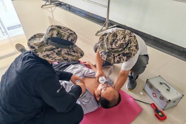 首先,演练团队模拟作业人员在巡检时突发中暑倒地,随行人员发现后立即汇报应急小组组长,应急小组组长立即赶往现场并启动应急预案。随后,针对员工中暑情况,演练团队及时启动员工救援程序,救援人员迅速携带急救药箱赶赴现场,对中暑员工进行紧急救治,并安全转移到阴凉通风处平卧,及时给患者头部捂上冷毛巾及擦拭酒精降温,饮用清凉饮料及时补水,通过按压穴位使患者苏醒,并根据患者情况及时送医治疗。
