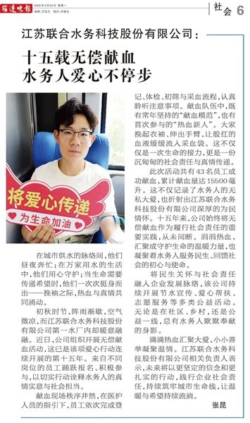 本次活动,共有43名员工完成献血,累计献血量15500毫升,这不仅记录下水务人无私奉献的赤诚,也映照出联合水务的为民情怀。十五年来,公司坚持把无偿献血作为履行社会责任的重要实践,从未间断,涓涓热血,凝聚着联合水务人守护民众的初心与力量。公司将民生关怀与社会责任融入企业发展脉络,持续组织开展节水宣传、爱心帮扶、志愿服务等活动。无论是在社区、乡村,还是在公益一线,都能看到联合水务人的身影。