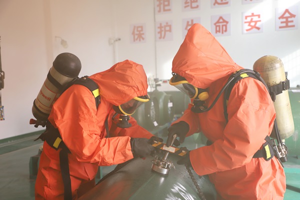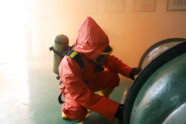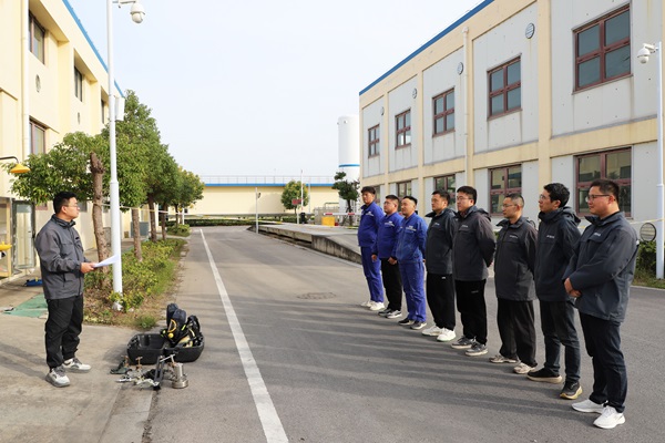 为确保演练安全、高效、有序开展,公司提前制定了详细的应急演练方案,明确人员分工、演练流程及安全措施。演练前,制水部主管张新宇系统讲解了液氯的特性与泄漏风险,现场演示了正压式空气呼吸器、防化服的正确穿戴方法,以及液氯钢瓶堵漏工具的操作要领,确保所有人员心中有数、行动有章。