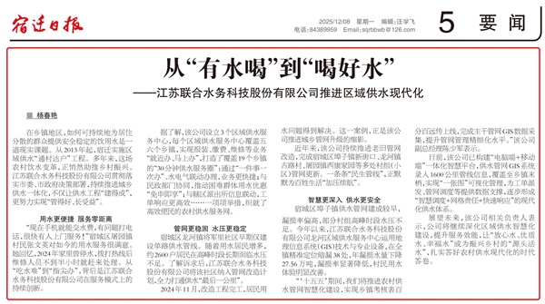 宿城区埠子镇供水管网建成较早,漏损率偏高,部分村组高峰时段水压不足。今年以来,江苏联合水务科技股份 有限公司龙河区域供水服务中心运用地 理信息系统(GIS)技术与专业设备,在全镇精准定位暗漏38处,年漏损水量下降 27.56 万吨,漏损率显著降低,村民用水体验明显改善。 “‘十五五’期间,我们将推进农村供水管网智慧化建设,实现乡镇考核表百 分百远传上线,完成主干管网GIS数据采 集,提升管网管理精细化水平。”该公司副总经理陈少军表示。
