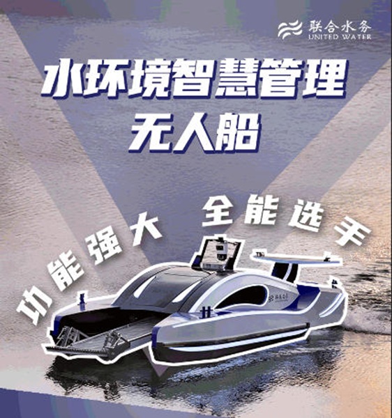 作为联合水务的明星产品,这艘无人船,堪称水上“全能特种兵”!它集监测、分析、诊断、运维、修复于一体,拥有八大硬核功能:实时监测水质、溯源污染排口、测绘水下地形、普查生物多样性、收割清漂、智能安防,还能应急除藻、沉浸式巡河。它懂水,更懂治水,三大独家技能很能打:实现总磷走航式监测,填补了市场空白;能根据水下地形自主调节水草收割深度;可搭载多项水质调节和藻类控制的自主研发的配套产品,实现应急维护。