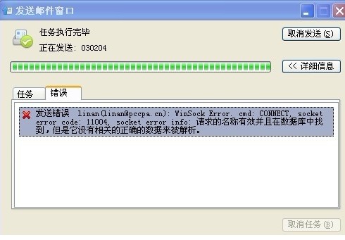 其导致的结果就是可以收邮件,不能发邮件。检查发送服务器的设置,地址为smtp.united-water.com,这个是正确的地址,网上说的方法是要将电脑的DNS设为自动获取。但是这台电脑的DNS本身就是自动获取的,我选择重装foxmail,重装完毕后,问题仍然没有解决,邮件照样发不出去。真让人伤脑筋,这可让我这个自诩微机高手的人脸上有点挂不住了。只能从错误信息本身入手了,“没有相关的正确的数据来被解析”,实际上相当于网址不能解析,那要是换成IP地址呢,我使用ping命令,ping出发送服务器的IP地址,并将其填入发送服务器地址内。再试,问题解决了。但是这仅仅是解决了问题,问题出在哪里呢,再上网查域名不能解析的情况,往往因为是DNS缓存未清除的原因。在cmd命令下,输入ipconfig /flushdns就可以清除DNS缓存了,一般情况下此命令可解决90%的域名不能解析的问题。如果还不行,那就只有重做系统了。