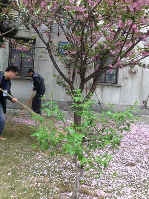 公司全体员工以部门为单位,对各卫生区域进行彻底的大扫除。针对工程公司财务部的卫生区,高经理对我们特别强调了以下几点:一是对草坪中的杂草进行一次有序地清除;二是对于前排屋檐下杂乱无章的垃圾要清除彻底;三是面对落叶要做到随时随地捡起;我们部门的卫生区内有棵美丽的樱花树,随风起舞,层层花瓣娇艳动人,翩翩起舞的樱花让我们大饱眼福的同时也给我们带来了些许烦恼,那随时可能会飘落的小小樱花瓣清扫起来着实不易,但是为了打造一个整洁的环境,我们必须也一定要完成任务。