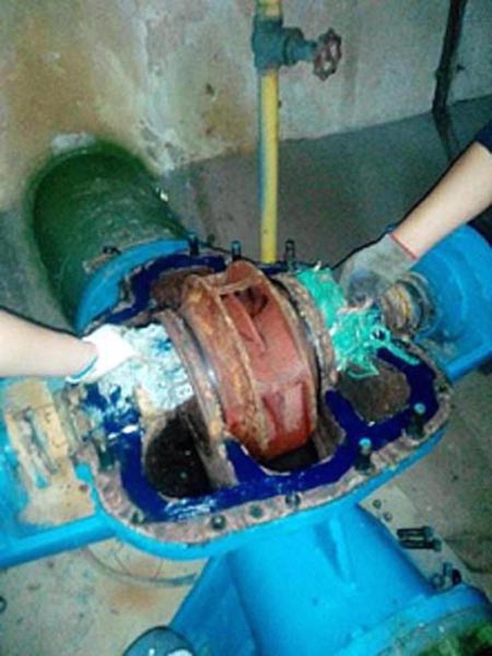 5月8日下午,已经临近下班时间,机电设备部接到运河泵站值班人员反映水泵出水量偏小,考虑到马上就到了下班用水高峰阶段,为了不影响市民的正常用水,部门经理决定错开用水高峰时段,安排维修人员于晚上十点钟开始到现场进行问题排查解决。当晚十点钟维修人员准时到达现场展开维修工作,初步判断是四号机组泵体存在故障问题。果不其然,打开水泵泵壳检查后发现,泵体的叶轮被大量异物堵塞。查明故障原因后维修人员立即采取行动,清除缠绕在叶轮上的异物,同时为水泵更换上了新的盘根,解决了水泵的漏水的问题。经过维修人员的维修,运河泵站四号机组恢复正常工作,水泵出水量达到供水要求。