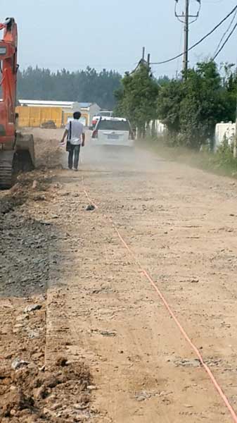 此次的勘测地点是经二路,这次的任务有一定的难度,工程造价部经理、工程管理部经理及管网部经理和我们的勘测人员一同前往现场,帮助我们完成公司安排的任务。勘测现场一片混乱,路面已经被严重破环,给我们的勘测带来了很大的困扰,幸好三位领导对现场情况都有一定的了解,经过一番探索,我们好不容易找到了残疾人福利院的接水点,考虑到路面施工情况以及我们的管线铺设难度,最后确定于路西侧铺设一条管道与原有管线对接。方案定下来后就得开展测量工作了,由于近阶段工程公司的工程较多,我们部门的轮式测距仪被其他同事征用,因此我们只能拿着50米的卷尺以最原始的方式进行测量。