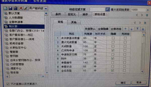 3、除了选择相应的查询时间段外,更重要地是把你常用功能的表格给设置好。选取表格设置选项后,根据自己工作的实际需要把自己常用的功能选项按向上箭头或向下箭头调到合适位置并选好列宽,也可把用不到的项目直接隐藏,并点击左上角的保存(不点击仅当次有效)
