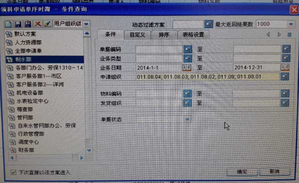 2、在常用功能中打开任一功能菜单,系统都是默认方案。这里我建议把默认方案给自定义为自己的个人方案,并在左下角的“下次直接以该方案进入”前方框内打勾(下表是以制水部领料申请单为例),以便于下次打开直接登陆。