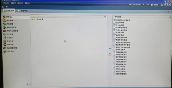 1、在输入个人工号和密码登陆EAS系统之后,先把自己经常要用的功能添加到“功能菜单”的右边“常用功能里(如领料申请单新增、领料申请单查询、费用报销单新增、费用报销单查询、库存调拨单查询等)以便于自己快速、准确地查看到单据状态。