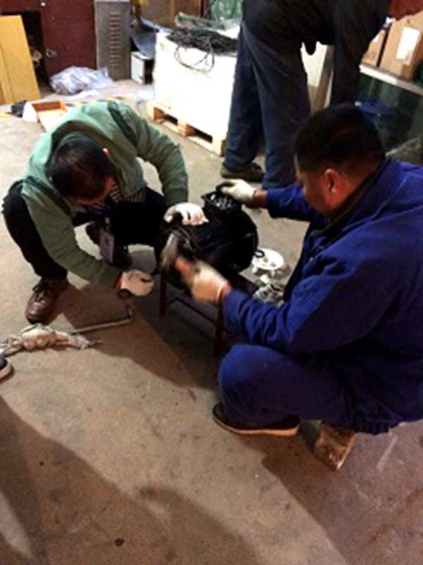 下午2:20,地点二水厂,维修板房压力机,原因为自动运行液压机超压不停机,自动开启以后发现在达到压力上限的时候油压机仍在工作,压力仍一直上升,因为是二手设备,而且据运行人员运行观察,在油压达到最大的时候,自动停机液压设备,在压力下降到低限的时候,自动启动液压机。后经过再三测试,最终确定在压力达到上限的九秒左右才停止油压机,最终结果在运行后再确定。