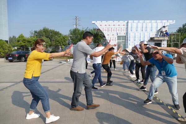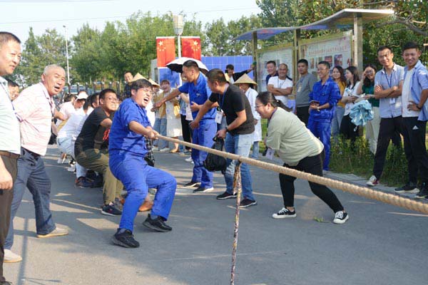 亭皋木叶下,陇首秋云飞。九月时节,秋高气爽、云淡风轻,但正午的阳光依然强烈。骄阳与炎热阻挡不了我们热情的脚步,来自全公司各部门共242名参赛选手,早早聚集在二水厂办公楼前广场,参加拔河、投飞镖、瞎子敲锣共三个项目的角逐。平时,各部门人员各自坚守岗位,难得有机会齐聚一堂,大家欢声笑语,谈论着比赛项目,回忆着公司近些年的不断发展壮大,称赞着焕然一新的二水厂,更深深抒发着祖国日新月异、不断强大的自豪感。随着国庆节的来临,办公楼前布置了浓厚的喜庆氛围,花团锦簇,五星红旗迎风招展,激发了大家深深的爱国情。